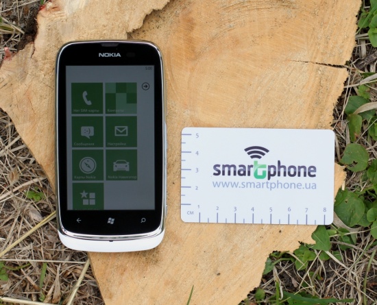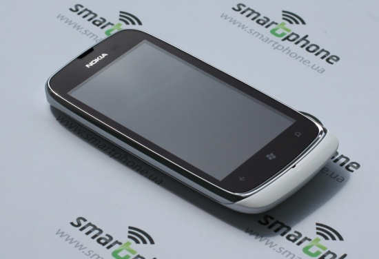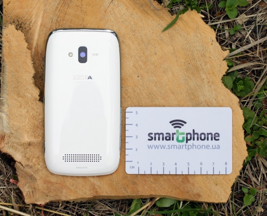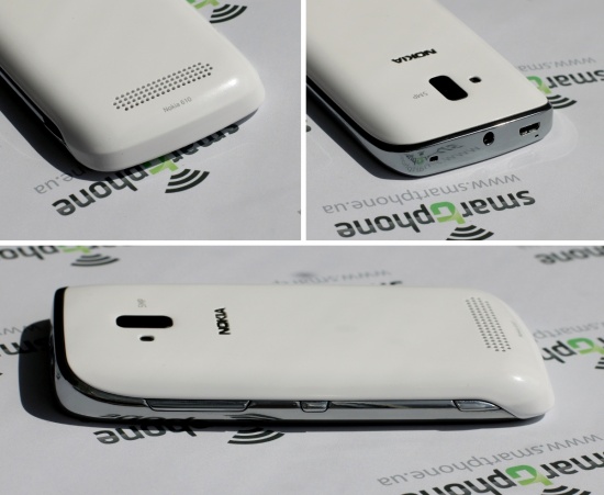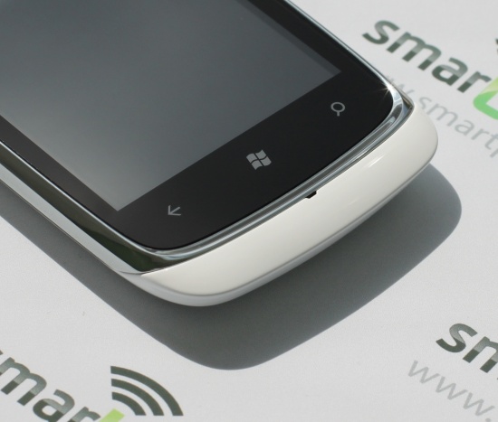 Что также не заставит владельца Nokia Lumia 610 «краснеть», так это дизайн устройства. Превосходное сочетание белого пластика, с визуально, повторюсь покрытием, напоминающим керамическое, хорошо дополняется мощной серебристой окантовкой по периметру и симпатично оформленной лицевой панелью. Кстати, если вы, уважаемые читатели, думаете, что покрытие лицевой панели пластик, спешу заверить в ошибочности этого мнения. На самом деле, здесь стекло. Хорошее, прочное защищенное стекло. По крайне мере, ни от транспортировки на протяжении месяца в кармане джинсов, ни от наглого эксперимента, во время которого я взял монетку и с силой потер краешком по панели. Хотите, поверьте на слово, а хотите, проверьте при случае – сработано даже очень неплохо!