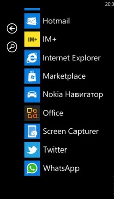 Nokia Maps, Nokia Transport, Nokia Drive, магазин Skydrive, Xbox Live Hub, Facebook, Twitter, LinkedIn |