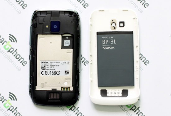 При беглом осмотре корпуса, можно ошибочно предположить, что зеркальная окантовка Nokia Lumia 610 изготовлена из металла. Это так лишь визуально! На самом деле перед нами пластик, но отличный по качеству.