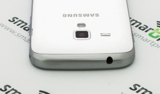 Передняя панель Samsung Galaxy S Duos (S7562) разделена между 4-х дюймовым дисплеем, аппаратной и двумя сенсорными кнопками, а также сеткой коммуникационного динамика и глазком фронтальной камеры.