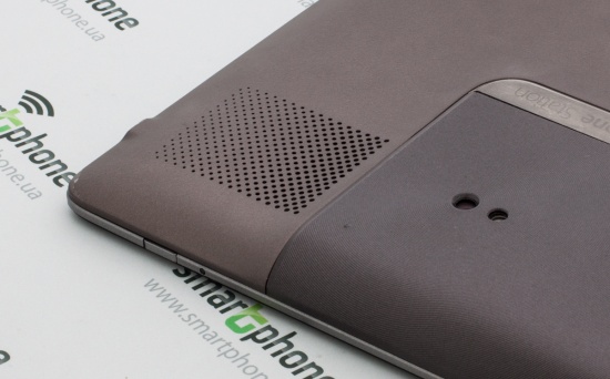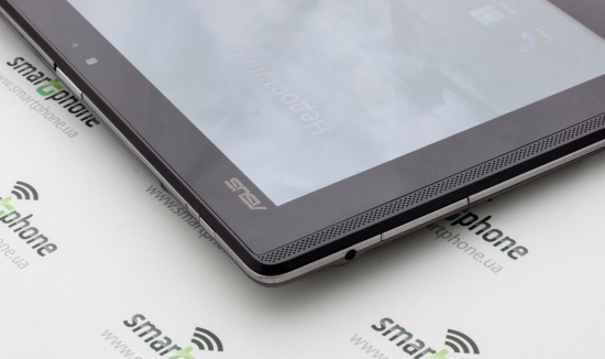 Конечно же, ключевые позиции на лицевой панели у дисплея. Он занимает здесь почти все место. Если установить планшет на клавиатуру и рассматривать, таким образом, справа и слева легко заметить небольшие пластиковые вставки, которые стекло не прикрывает. Визуально такое оформление можно принять за реализацию выводов встроенных динамиков, но в сущности это только декор. Динамики же вынесены на тыльную панель Padfon Station.