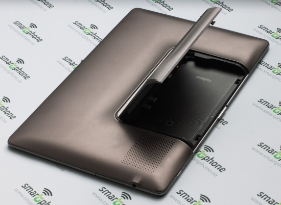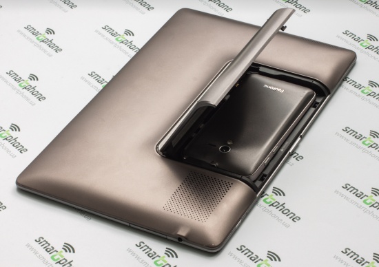 Посмотрим теперь на Padfon Station аппаратно! Корпус пластиковый, окантовка металлическая, дисплей прикрыт стеклом Gorilla Glass. Кроме того, металлическая вставка есть и на тыльной панели. К ней крепится крышка, скажем так, смартфонного отсека.