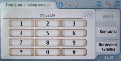 Телефонная оболочка предельно проста, она содержит виртуальную цифровую клавиатуру, строку набора, в которой в режиме ожидания выводится название текущей GSM-сети, а также ссылки на адресную книгу и списки недавних вызовов (входящие, исходящие и пропущенные — на соответствующих панелях в одном окне). Некоторые специфические операции можно выполнить при помощи системного меню.