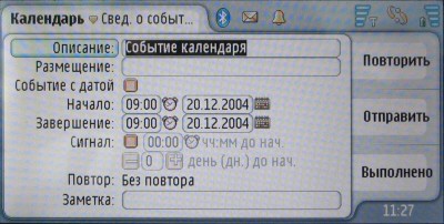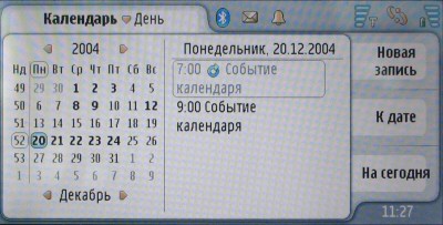 Календарь в Nokia 7710 имеет два основных режима отображения. Первый из них — двухпанельный, на левой панели выводится таблица дат на месяц, на правой — расписания текущего дня. Второй режим — еженедельный, он занимает целый экран. Возможности программирования напоминаний также близкие к тем, что предлагает Nokia Series 80 — строго определенных типов напоминаний нет, описание полностью задается пользователем, есть гибкая и мощная система программирования упреждающего оповещения и повторяющихся событий.
