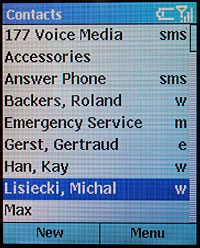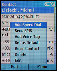 Для быстрого доступа к списку контактов из режима ожидания используется правая софт-клавиша. Для поиска можно пользоваться прокруткой, она работает достаточно быстро, либо нажимать цифровую клавишу с буквой, с которой начинается искомая запись. Здесь есть один отрицательный момент — многократное нажатие, по идее позволяющее вводить по очереди любую букву, обозначенную на кнопке, здесь вводит последовательность букв, и даже все возможные последовательности, которые может составить из букв на этой кнопке алгоритм Т9. Любопытно, что даже на нерусифицированном телефоне, в который загружены русскоязычные записи из Outlook, при такой попытке поиска без проблем выбираются русские буквы, которые должны быть на соответствующей клавише. Вывод — «в глубине души» система прекрасно понимает русский, но без программы локализации не даёт об этом знать. Что ж, это должно существенно облегчить работу локализаторов, но Microsoft вполне могла бы и сама позаботиться о бесплатном language pack, благо для настольной Windows такие существуют.