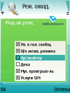 Одной из особенностей модели Е50 в рамках Eseries, да и прочих смартфонов от Nokia, является несколько переработанный активный режим ожидания, его функциональность повысилась, впрочем, как и удобство. Изменения заключаются в следующем: в меню настроек режима ожидания появился список функций, уведомления которых можно вывести на экран. Вроде бы опция не столь значительна, но, тем не менее, приятна. Есть возможность оставить на рабочем столе лишь ярлыки, без поля заметок.