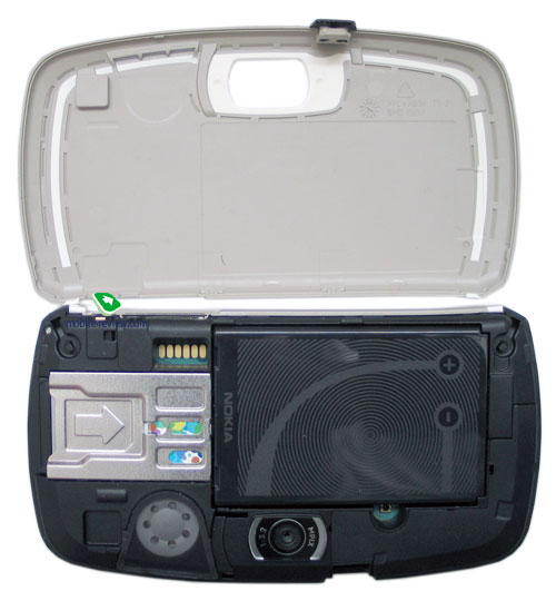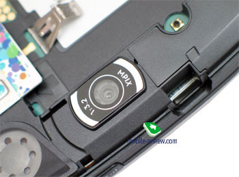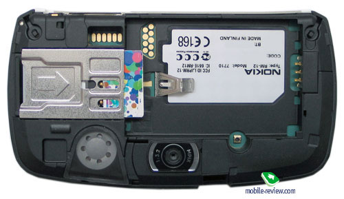 На задней стороне можно видеть объектив мегапиксельной камеры, выход для динамика один. Открыть аппарат, можно надавив на защелку и потянув панель вверх. Панель стоит хорошо, нет ни малейшего люфта. Внутри вы можете видеть слот расширения для ММС-карт, доступ к нему возможен без изъятия аккумулятора. Производитель подразумевает «горячую замену» карт для этого смартфона, но надо помнить, что предварительно требуется демонтаж задней панели, это в большинстве случаев не слишком удобно и просто.