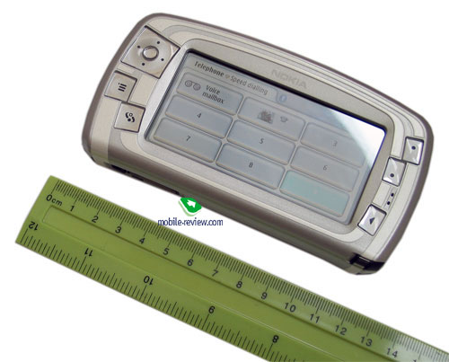 Размеры устройства 128х69.5х19 мм, они максимальны на сегодняшний день и превышают даже ряд устройств построенных на MS Windows Mobile, к примеру, i-mate JAM. В сравнении с современными телефонами Nokia 7710 гигант, а вот смотря на смартфоны видишь, что устройство не слишком толстое, сравнимое с обычными аппаратами. Размер играет двоякую роль, с одной стороны обращаться с Nokia 7710 одной рукой невозможно, еще примите во внимание вес в 189 грамм. С другой стороны и носить аппарат на себе не слишком удобно, в карман рубашки он не помещается (если только вы не обладатель 60-62 размера), на шее выглядит примерно как цифровая мыльница, ощущения сравнимы. Остается рекомендовать носить это устройство либо в больших карманах спортивных пиджаков, либо снаружи в сумках. Назвать устройство таких размеров мобильным не поворачивается язык.