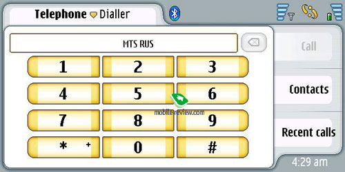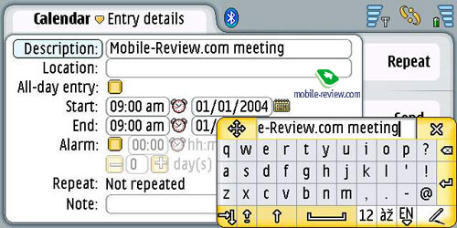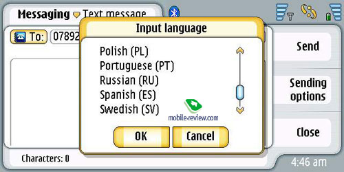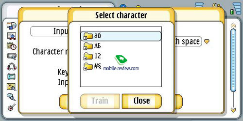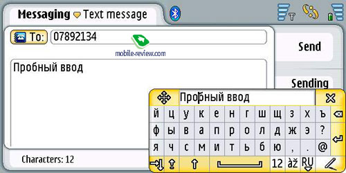 Второй путь для ввода текста это рукописное распознавание, оно работает для всех поддерживаемых языков, в том числе и русского. Реализация распознавания простая, во всплывающем окне можно писать отдельные буквы. Скорость реакции аппарата приемлема, хотя набор на виртуальной клавиатуре более быстр. Размер окна для ввода букв может быть двух размеров. Окно, как и виртуальную клавиатуру можно передвигать по экрану. К примеру, в продуктах Sony Ericsson писать можно в любом месте экрана, ввод более быстр, хотя локализация уступает возможностям Nokia 7710.