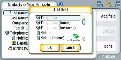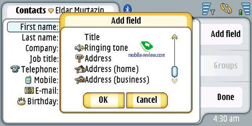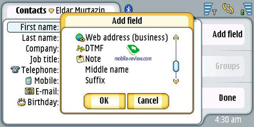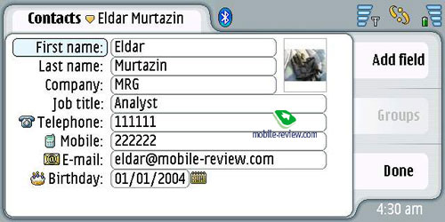 Контакты. Число имен не ограниченно, для одного имени можно указать практически любое число полей (дополнительные поля доступны из режима редактирования). Есть своя фотография для полей, синхронизация с MS Outlook не вызывает никаких проблем. Описывать все возможности контактов не будем, они максимальны, как и положено коммуникатору.