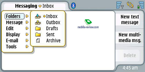 Сообщения. Аппарат поддерживает SMS-сообщения, соединенные сообщения, Nokia Smart Messaging. Все предельно просто и понятно, та же организация в обычных телефонах компании, здесь работать с текстом проще за счет наличия клавиатуры.