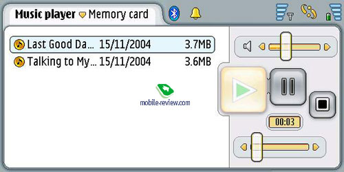 Music Player. Позволяет проигрывать большинство форматов, стандартный выход выводит стерео звук. Из очевидных недостатков работа только с одной выбранной папкой (список последних просмотренных папок доступен из меню, что является плюсом). Применять Nokia 7710 в качестве мр3 плеера можно, но смысла в этом мало, уж больно большие размеры у устройства.