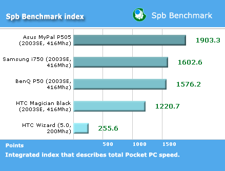 Дня начала проведем наш стандартный тест пакетом SPB Benchmark, для сравнения возьмем схожие функционально Pocket PC. Здесь мы не приводим итоговый индекс, т.к. он для новой версии ОС сильно искажается.