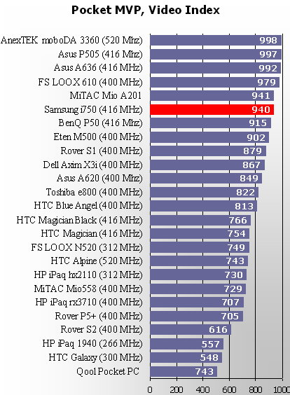 Приведем результаты тестов в реальных приложениях, они больше перекликаются с действительностью. При воспроизведении видео КПК показал хорошие результаты. В данном случае – без использования оптимизации под Wireless MMX (функция процессора PXA27x), воспроизводилось четыре ролика различной интенсивности потока, на основании количества выпавших кадров формировался индекс. Чем меньше выпавших кадров, тем больше индекс. Индекс 1000 означает отсутствие выпавших кадров вообще.