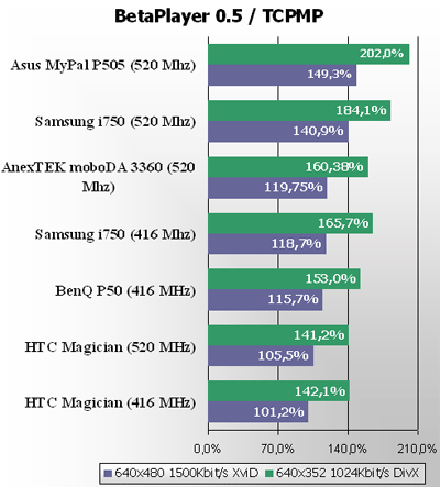 Если по каким-то причинам вам не хватит исходной производительности, то вы сможете разогнать Samsung i750 (единственное, чем грозит эта процедура – жесткая перезагрузка с потерей всех данных). Для примера мы разогнали процессор утилитой XCPUScalar, прирост производительности измерялся программой BetaPlayer, оптимизация под Wireless MMX включена. Наладонник работал стабильно при разгоне до частоты 520 МГц. Разгон выше сопровождался зависаниями, нестабильной работой.
