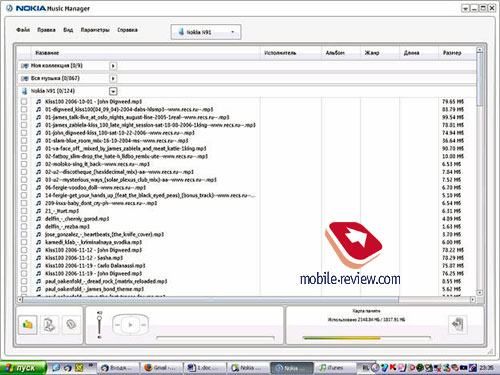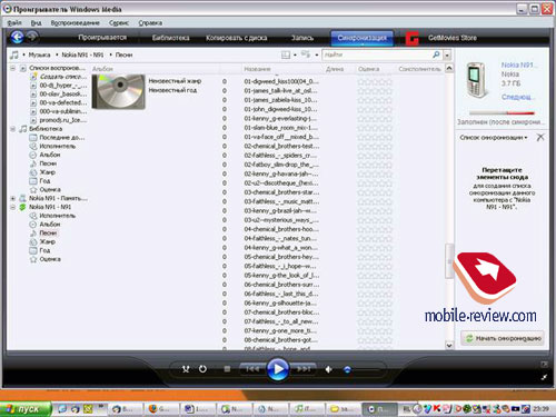 Что касается ПК, то лично пробовал использовать с N91 и Windows Media (11-я версия), и Nokia Music Manager. Первая мне не понравилась по той причине, что явно указывала:«Уважаемый пользователь, может, библиотеку-то свою разберете, наконец?» – а желания заниматься этим благим делом у меня нет, правка тегов вызывает практически фобию. Максимум, что можно сделать, это найти обложки для легко опознаваемых дисков. Как вы видите на скриншоте, N91 легко распознается программой, вы можете синхронизировать данные. Лично я бы не стал этого делать, поскольку после таких синхронизаций музыка из библиотеки куда-то пропадает, приходится ее обновлять (файлы не удаляются) – скорее всего, проблема в пользователе, то есть во мне. Что касается программы, встроенной в PC Suite (речь про Nokia Music Manager), то она мне понравилась больше WM, во многом из-за «айтюнсоподобного» дизайна (правда, излишне аскетичного), простоты и наглядности. Минусы – при каждом запуске приходится заново производить поиск музыкальных файлов на ПК, отсутствует возможность выставления рейтингов, читаются не все теги, написанные на кириллице. При желании можно перекодировать файлы, переносимые на N91, в формат AAC, хотя с таким объемом это уже лишнее.