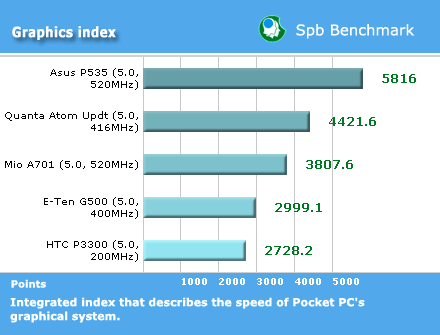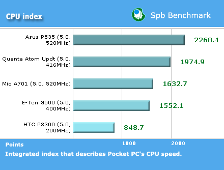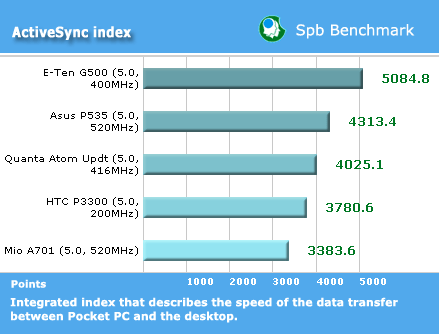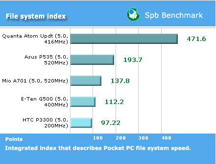 Мы не приводим итоговый индекс, поскольку он сильно искажен для Windows Mobile 5.0. По итоговому индексу среди всех коммуникаторов модель уступает только обновленному Quanta Atom за счет оптимизации работы с файловой системой.
