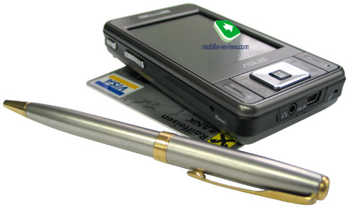 На верхнем торце расположился слот для карт памяти формата MiniSD, с помощью которого легко расширить память коммуникатора до 4 Гб. Здесь же находится кнопка питания, гнездо стилуса. Перо среднее по размерам, в целом удобно.