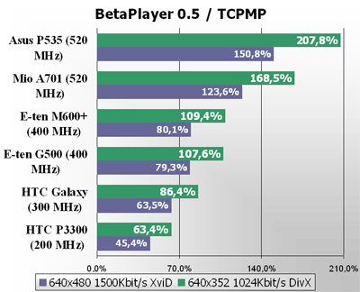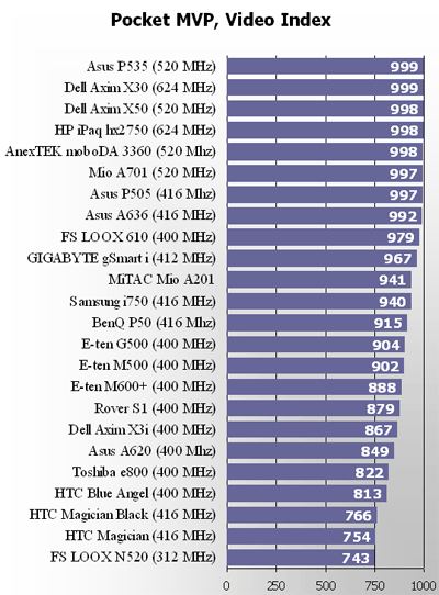 Мы провели тест видео в программе The Core Pocket Media Player, получились следующие результаты. Производительность во многом завязана на графические ускорители и набор Wireless MMX, который встроен в последний процессор Intel XScale. Производительность около 100% означает, что фильм в среднем воспроизводится без выпадения кадров, гладко, но возможны провалы на активных сценах.