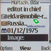 В телефоне есть только 5 групп абонентов, что нетипично для телефонов от Nokia. Для каждой из групп можно назначить свою мелодию звонка. Оценивая общее удобство телефонной книги, можно сказать, что она средняя. С одной стороны в ней есть много полей, с другой стороны реализация ввода приспособлена в большей мере для работы с ПК, а не самого телефона. Подчеркну, что в целом телефонная книга типична для аппаратов от Nokia, в ней нет принципиальных изменений, читай улучшений. Наиболее богатые возможности телефонной книги представлены в аппаратах от Siemens, затем следуют телефоны от Sony Ericsson и только затем Nokia.