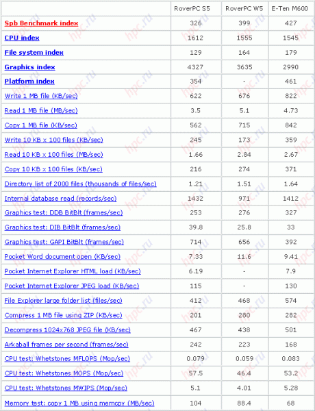 Для выяснения общей производительности, как всегда, использовался набор тестов Spb Benchmark от компании Spb Software House. В триста сорок первый раз повторим, что из-за новой организации памяти в Windows Mobile 5.0 бенчмарк некорректно рассчитывает быстродействие платформы и индекс файловой системы. Поэтому обращать внимание следует только на пункты Graphic Index и CPU Index. Итак, результаты получились следующими.