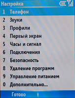 Меню телефона компактным никак не назовешь – оно состоит из 21 пункта. Естественно, что одновременно все пункты не отображаются. Для переключения страниц меню нужно нажать кнопку Дополнительно . Итак, меню состоит из: