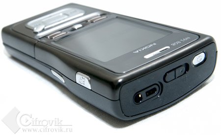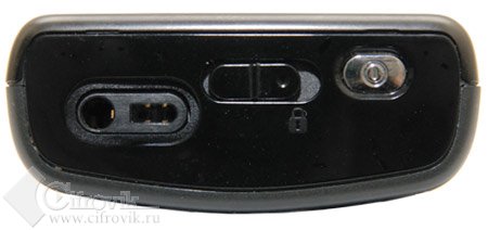 На верхней грани корпуса Nokia N91 приютилась кнопка включения-выключения аппарата, она же – выбора профиля (при кратковременном нажатии). Далее идёт очень интересный ползунок-переключатель, являющийся блокиратором клавиатуры – очень удобная штука для музыкального телефона, подчёркивающая его схожесть с плеером. На самом деле, я бы делал такие рычажки не только на музыкальных, но и на других телефонах. Некоторые производители, к слову, уже взяли эту идею на вооружение. Также сверху находится mini-jack для подключения любых наушников и второе гнездо – для подключения ПДУ штатной гарнитуры.