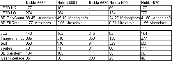 Тест 3D пакета SPMark04 на устройстве не заработал, также как и на Nokia N90. Нам осталось измерить производительность пакетом JBenchmark 2 и 3D.