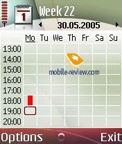 Разрешение и размер дисплея стандартны – 176х208 точек, 2.13” диагональ (41x35 мм – площадь активной области). Экран точно такой же, как на Nokia 6680/6681. В аппарате заявлено отображение 262 тысячи цветов. На практике вы не увидите отличий от экрана Nokia 3230, который отображает 65 тысяч цветов, аналогично с Nokia 6630. Цветность экрана остается имиджевой и только. Среди смартфонов без сенсорного экрана дисплей один из лучших. Сравнивать с экранами обычных телефонов не будем, такое сравнение некорректно. Отметим только, что разрешение 176х208 точек изживает себя, экран высокого разрешения мы увидим в модели Nokia N90 и в последующих продуктах. Продукты в моноблочном корпусе с новым разрешением экрана пока запланированы на начало 2006 года.